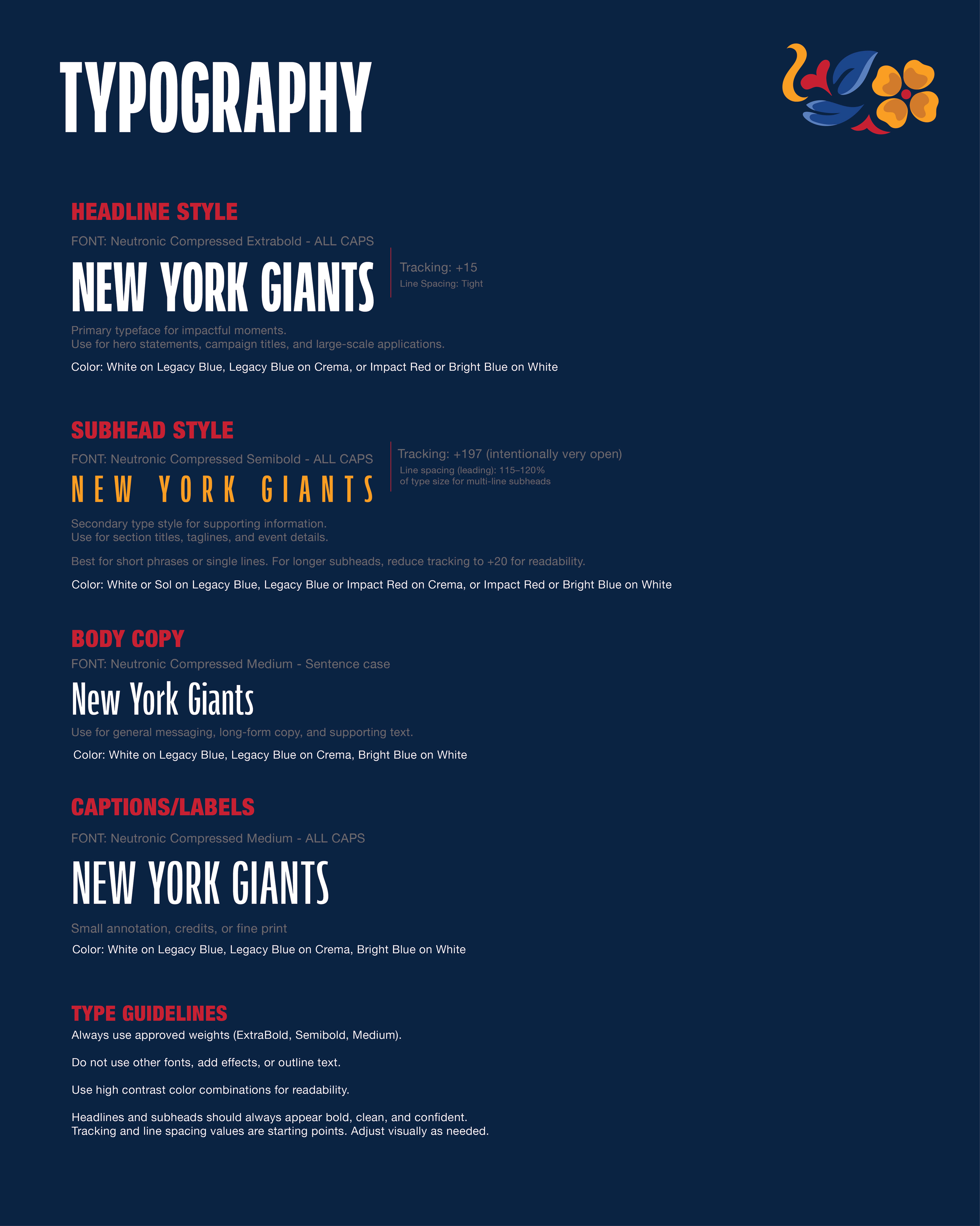 The logo balanced the Giants legacy with cultural expression, allowing it to hold weight inside the stadium while still feeling personal at street level. Color, typography, and pattern were treated as expressive tools, giving the system flexibility across large scale environments, product, and storytelling without losing cohesion or voice.