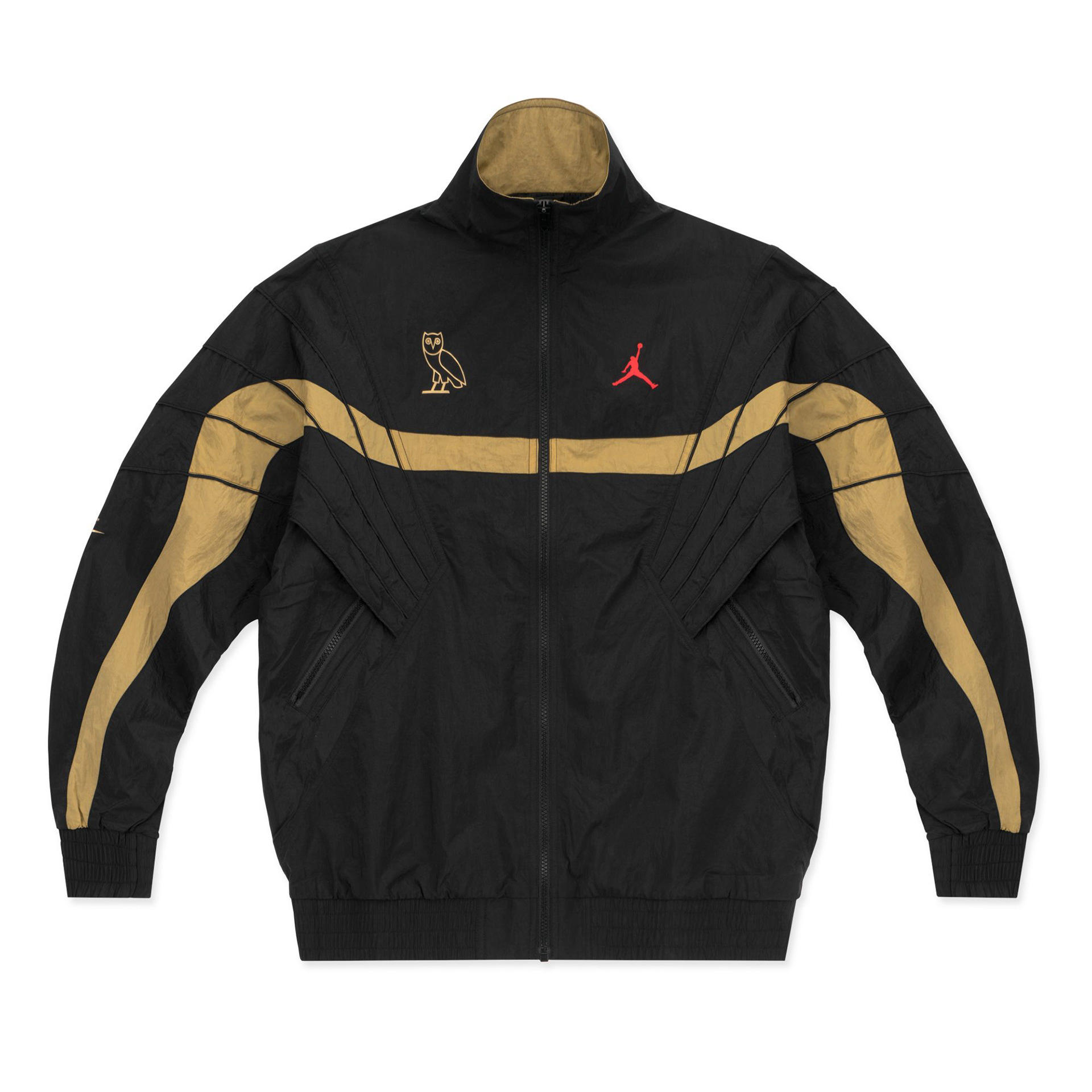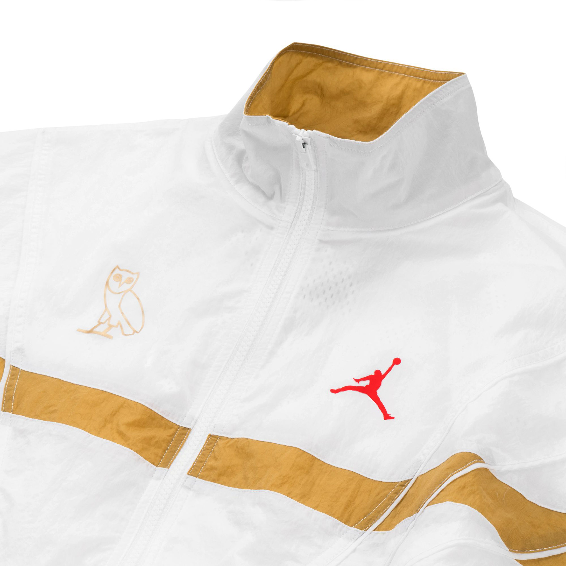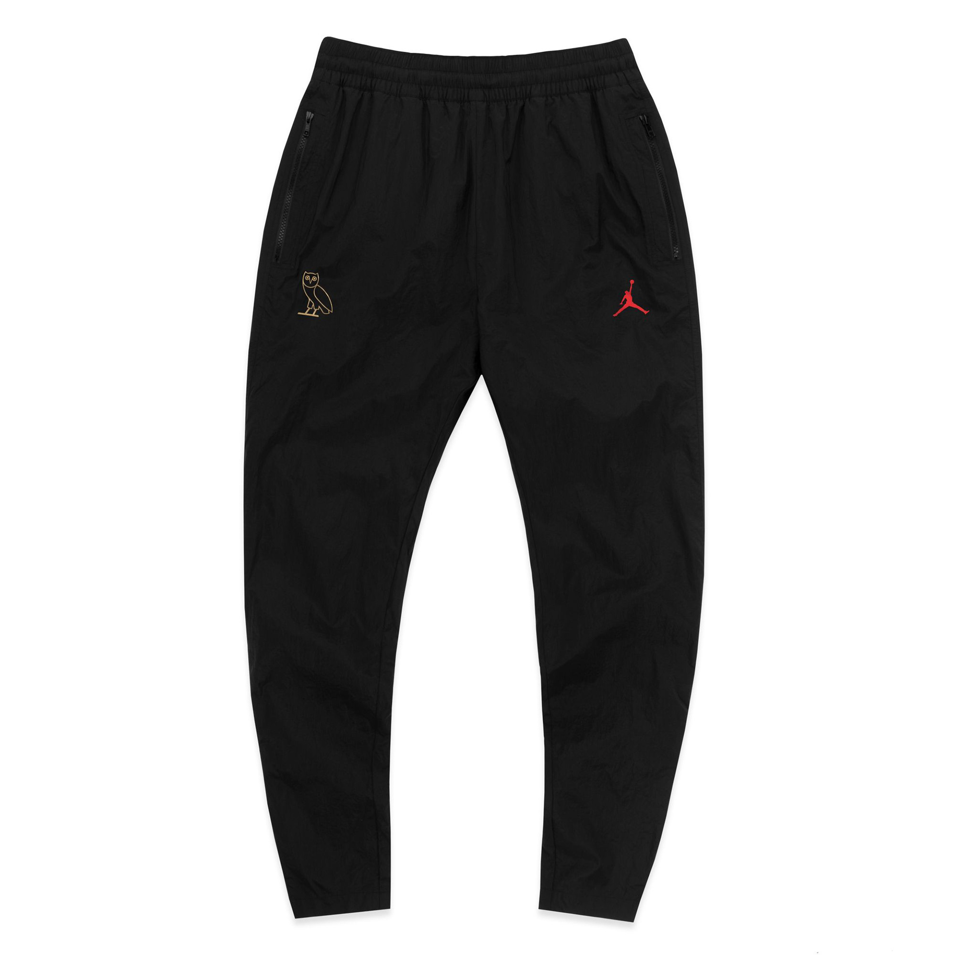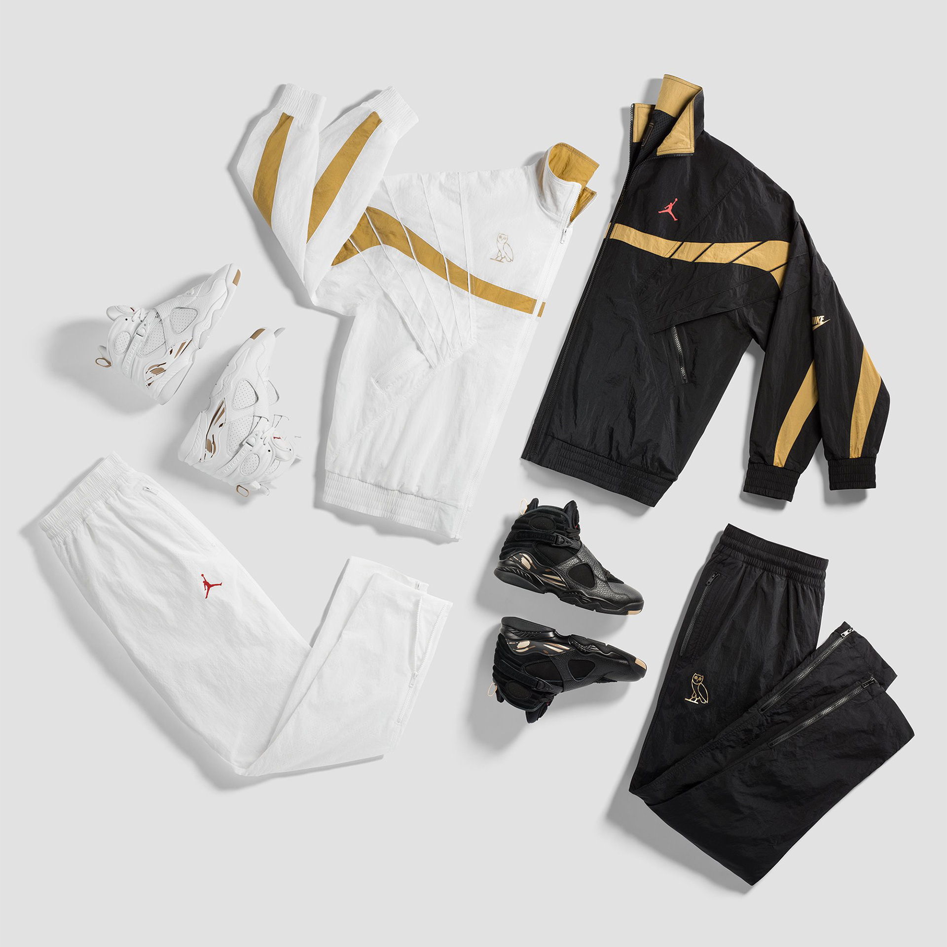 For retail, that concept was translated into a two-piece tracksuit pulled directly from the Jordan Brand archives. The original Jordan 5 tracksuit was brought back for the first time in years and updated through OVO’s palette and material language. Crinkle nylon in black and white mirrored the restraint of the footwear, while gold blocking introduced movement and cohesion across the collection.