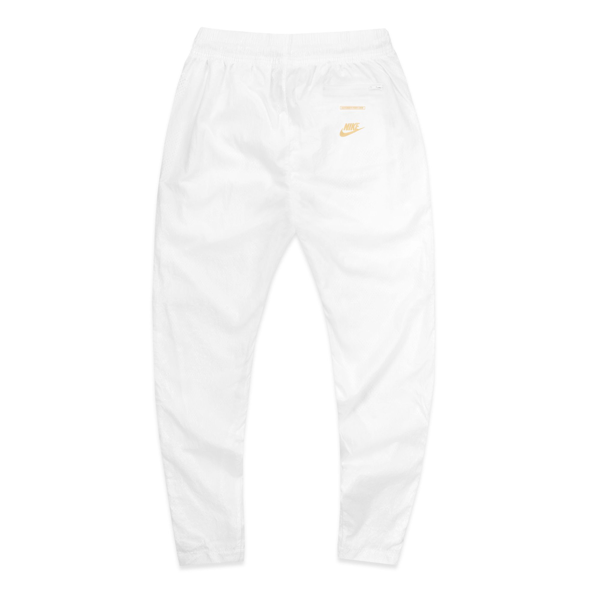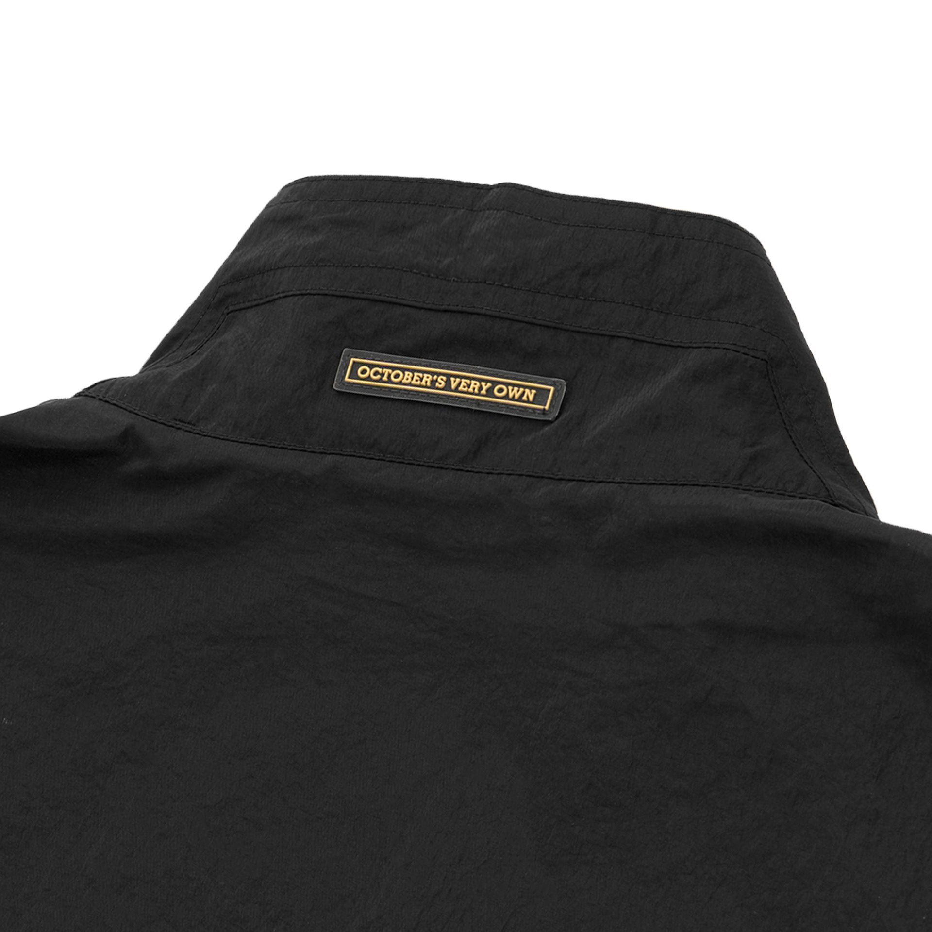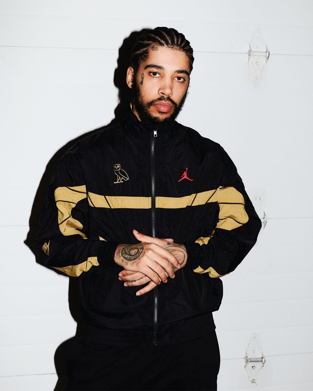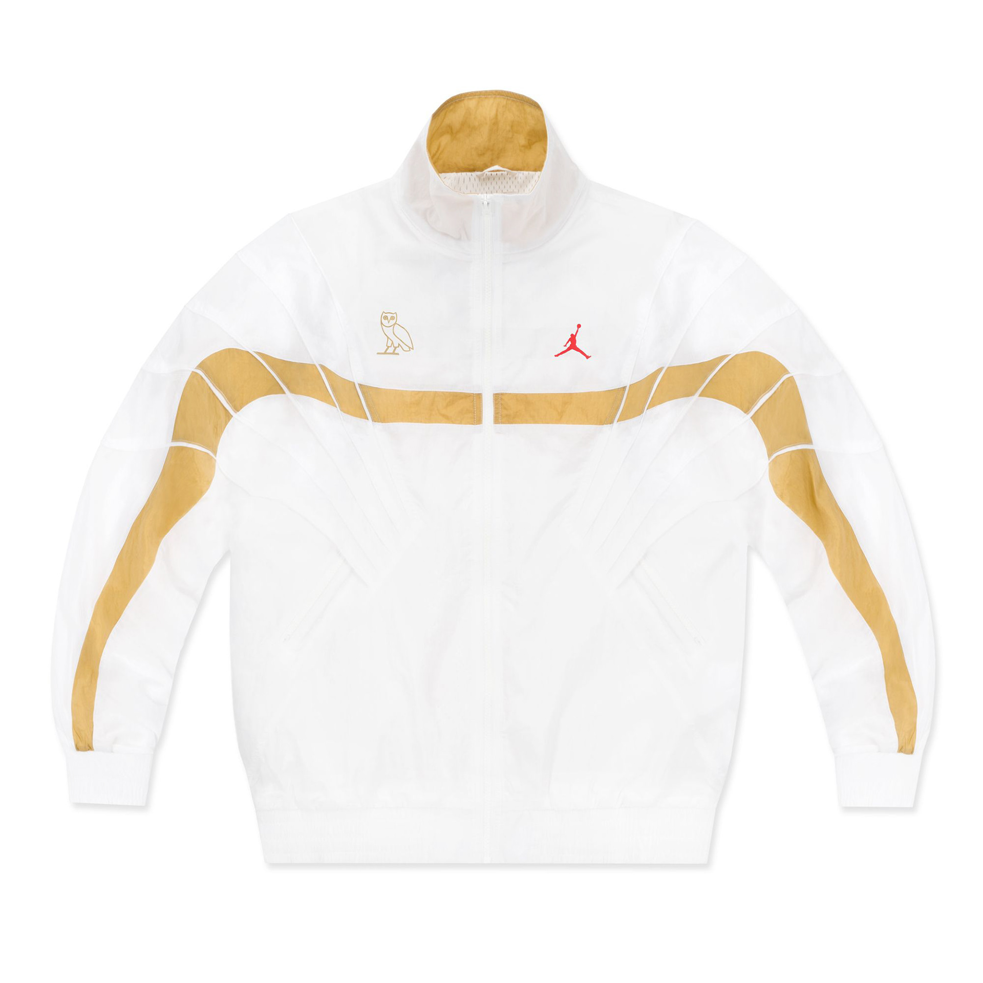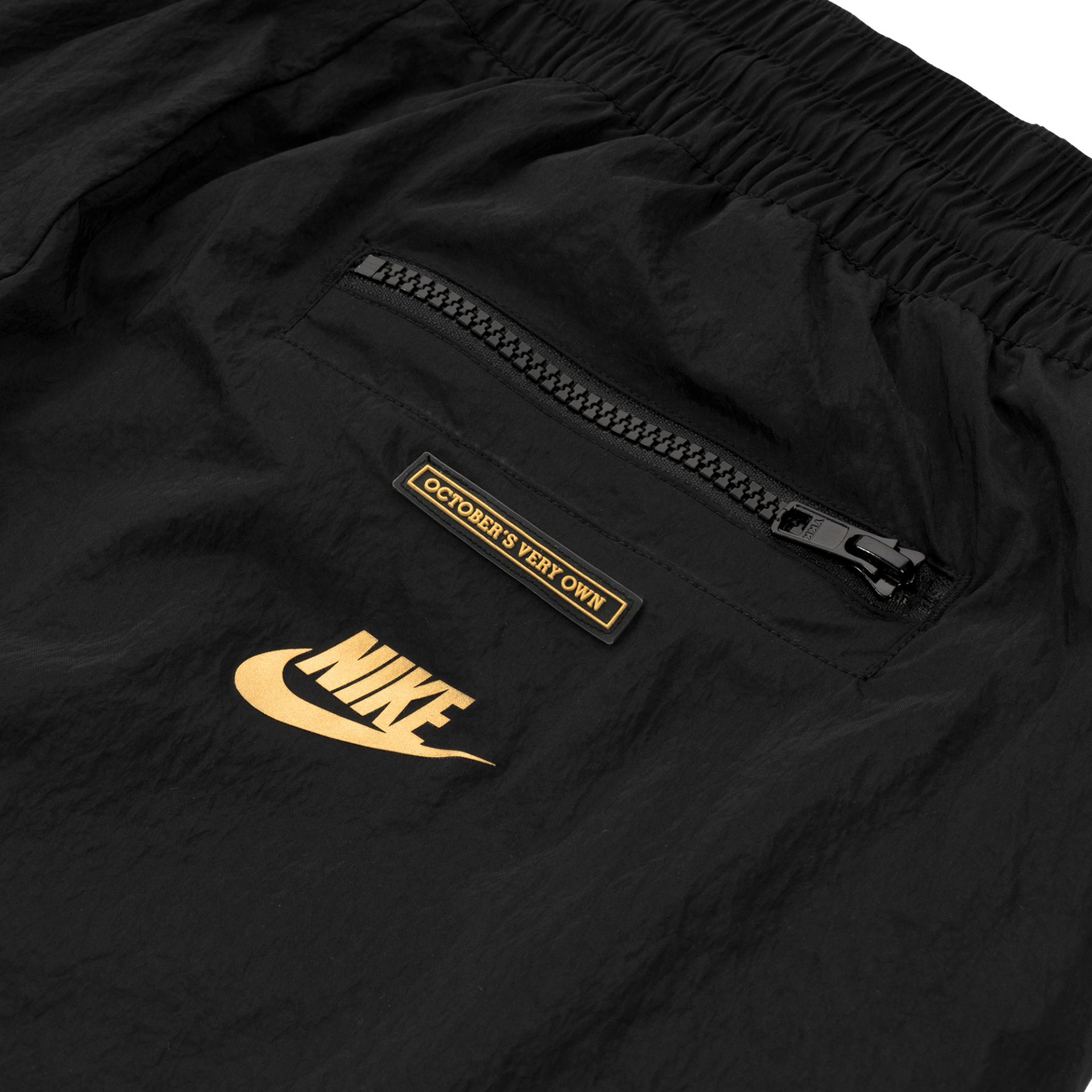 For retail, that concept was translated into a two-piece tracksuit pulled directly from the Jordan Brand archives. The original Jordan 5 tracksuit was brought back for the first time in years and updated through OVO’s palette and material language. Crinkle nylon in black and white mirrored the restraint of the footwear, while gold blocking introduced movement and cohesion across the collection.